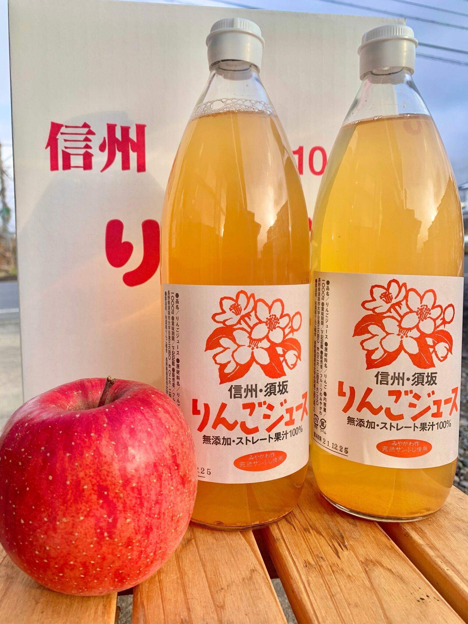 『2025年度収穫の信州産・完熟サンふじ』だけを使用した、果汁100%のストレートりんごジュースです。